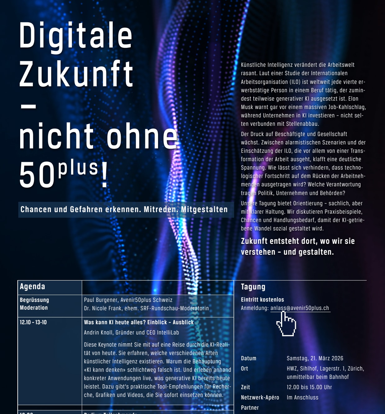 Die Tagung lädt dazu ein, die Auswirkungen von Künstlicher Intelligenz auf die Arbeitswelt aus der Perspektive von Menschen über 50 zu diskutieren. Im Mittelpunkt stehen Austausch, Orientierung und die Frage, wie der digitale Wandel inklusiv gestaltet werden kann.